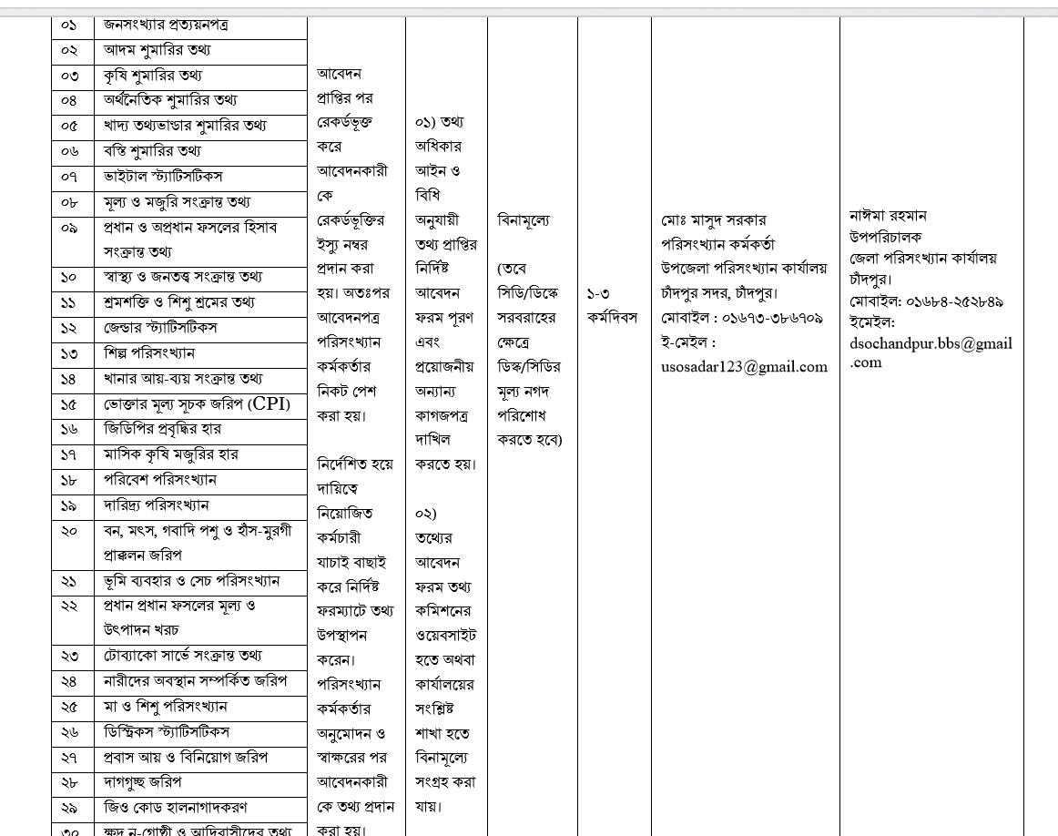 | ০১ | জনসংখ্যার প্রত্যয়নপত্র | আবেদন প্রাপ্তির পর রেকর্ডভূক্ত করে আবেদনকারীকে রেকর্ডভূক্তির ইস্যু নম্বর প্রদান করা হয়। অতঃপর আবেদনপত্র পরিসংখ্যান কর্মকর্তার নিকট পেশ করা হয়। নির্দেশিত হয়ে দায়িত্বে নিয়োজিত কর্মচারী যাচাই বাছাই করে নির্দিষ্ট ফরম্যাটে তথ্য উপস্থাপন করেন। পরিসংখ্যান কর্মকর্তার অনুমোদন ও স্বাক্ষরের পর আবেদনকারীকে তথ্য প্রদান করা হয়। | ০১) তথ্য অধিকার আইন ও বিধি অনুযায়ী তথ্য প্রাপ্তির নির্দিষ্ট আবেদন ফরম পূরণ এবং প্রয়োজনীয় অন্যান্য কাগজপত্র দাখিল করতে হয়। ০২) তথ্যের আবেদন ফরম তথ্য কমিশনের ওয়েবসাইট হতে অথবা কার্যালয়ের সংশ্লিষ্ট শাখা হতে বিনামূল্যে সংগ্রহ করা যায়। | বিনামূল্যে (তবে সিডি/ডিস্কে সরবরাহের ক্ষেত্রে ডিস্ক/সিডির মূল্য নগদ পরিশোধ করতে হবে) | ১-৩ কর্মদিবস | মোঃ মাসুদ সরকার পরিসংখ্যান কর্মকর্তা উপজেলা পরিসংখ্যান কার্যালয় চাঁদপুর সদর, চাঁদপুর। মোবাইল : ০১৬৭৩-৩৮৬৭০৯ ই-মেইল : usosadar123@gmail.com | নাঈমা রহমান উপপরিচালক জেলা পরিসংখ্যান কার্যালয় চাঁদপুর। মোবাইল: ০১৬৮৪-২৫২৮৪৯ ইমেইল: dsochandpur.bbs@gmail.com |